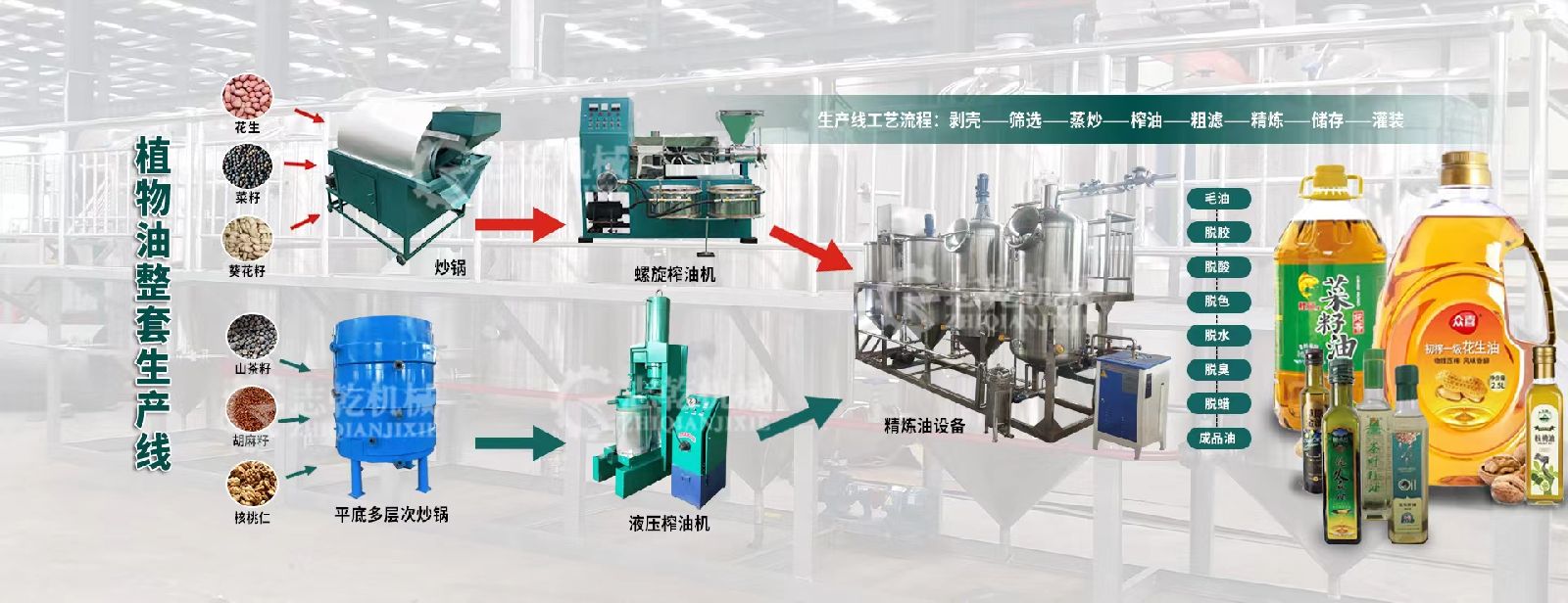 经过脱酸、脱胶、脱色、脱臭等工艺后,使压榨油的过氧化值、气味等指标达到国一标准,即食用油质量标准。 经精炼机处理后的油脂,色泽透明,长期放置无沉淀,下锅不起沫,无油烟,达到国家食用油标准,可直接灌装销售,适用于来料加工和小规模油脂加工厂使用。